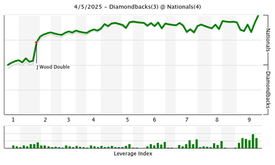 His pitch count was creeping up there, though, so the fifth inning was his last inning of work; he retired the Nationals in order again, with two more strikeouts, to bring his total to 12 Ks on the afternoon and finishing with a pitching line of 5 IP, 4 H, 4 ER, 1 BB, 12 K and 90 pitches thrown.